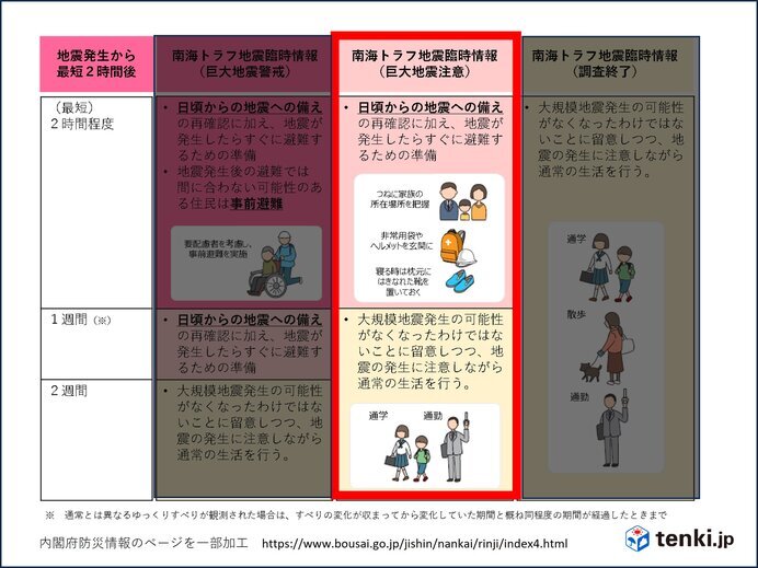 気象庁によると、特定の期間中に必ず巨大地震が発生することを伝えるものではありませんが、政府や自治体からの呼びかけに応じた防災対応をとる必要があります。改めて地震への備えを確認しておいてください。